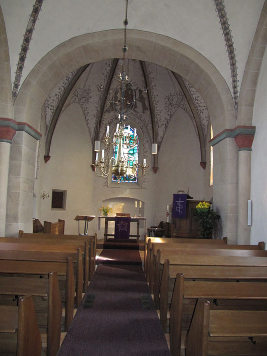 An den Turm schließt ein romanisches Schiff an, das ins beginnende 13. Jahrhundert datiert wird. Dessen Chorschluss wurde 1502 von einem gotischen Chor mit drei großen, spitzbogigen Fenstern abgelöst. Die Ecken des Chors sind von starken Strebepfeilern flankiert. Damals muss auch das Obergeschoss des Turms mit seinen schmalen, zweiteiligen, mit Maßwerk versehenen Schallfenstern erneuert worden sein. Das Schiff hat an seiner Nord- und Südseite jeweils zwei romanische Fenster. Das Portal der Nordwand wirkt in seiner kastenartigen Umrahmung dem Langhaus vorgesetzt. Dabei handelt es sich um ein romanisches Säulenportal, dessen Rundbogen auf zwei mit Schuppen verzierten Konsolen ruhen.